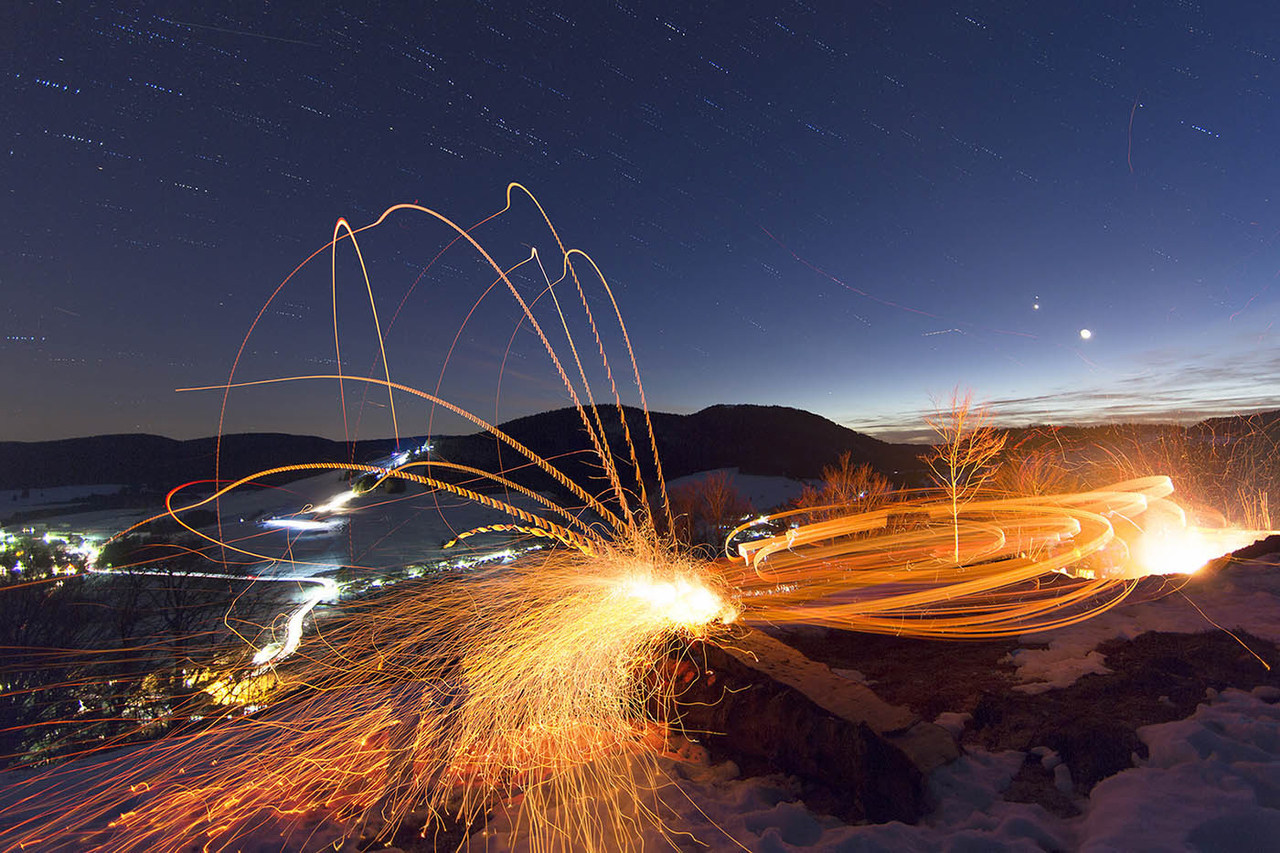 So schön lodern die funken und ziehen ihre Bahnen in den Nachthimmel: Beim Scheibenschlagen im Bernauer Hochtal. Foto: Achim Mende.
